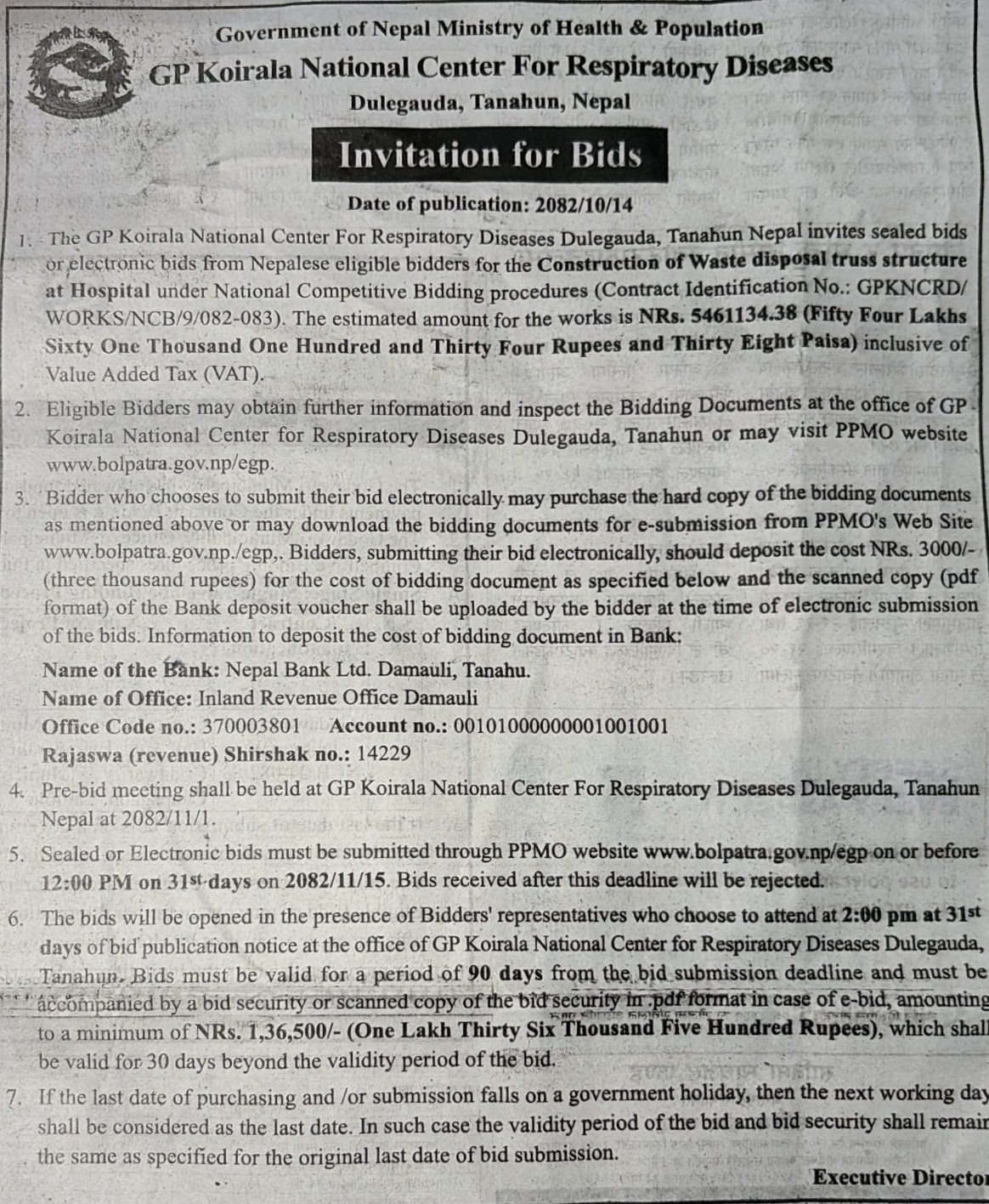 | 231 | Jiri Municipality, Dolakha | Improvement of civil works at Jiri Hospital | 27/01/2026 | PPMO | 11/02/2026 | Click Here | |