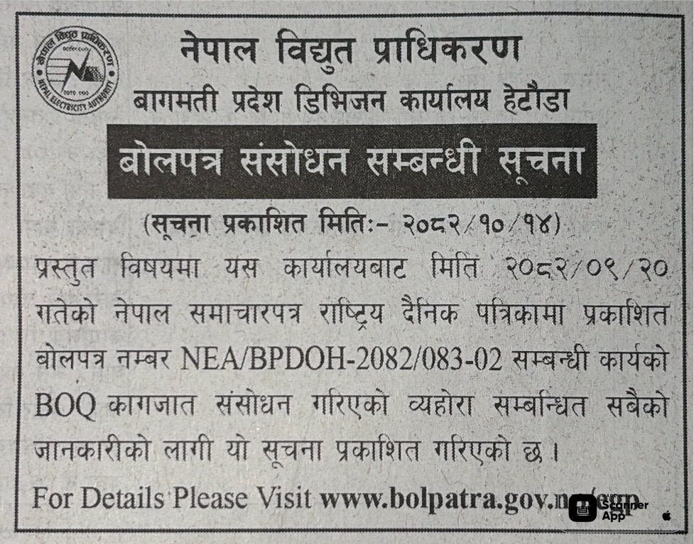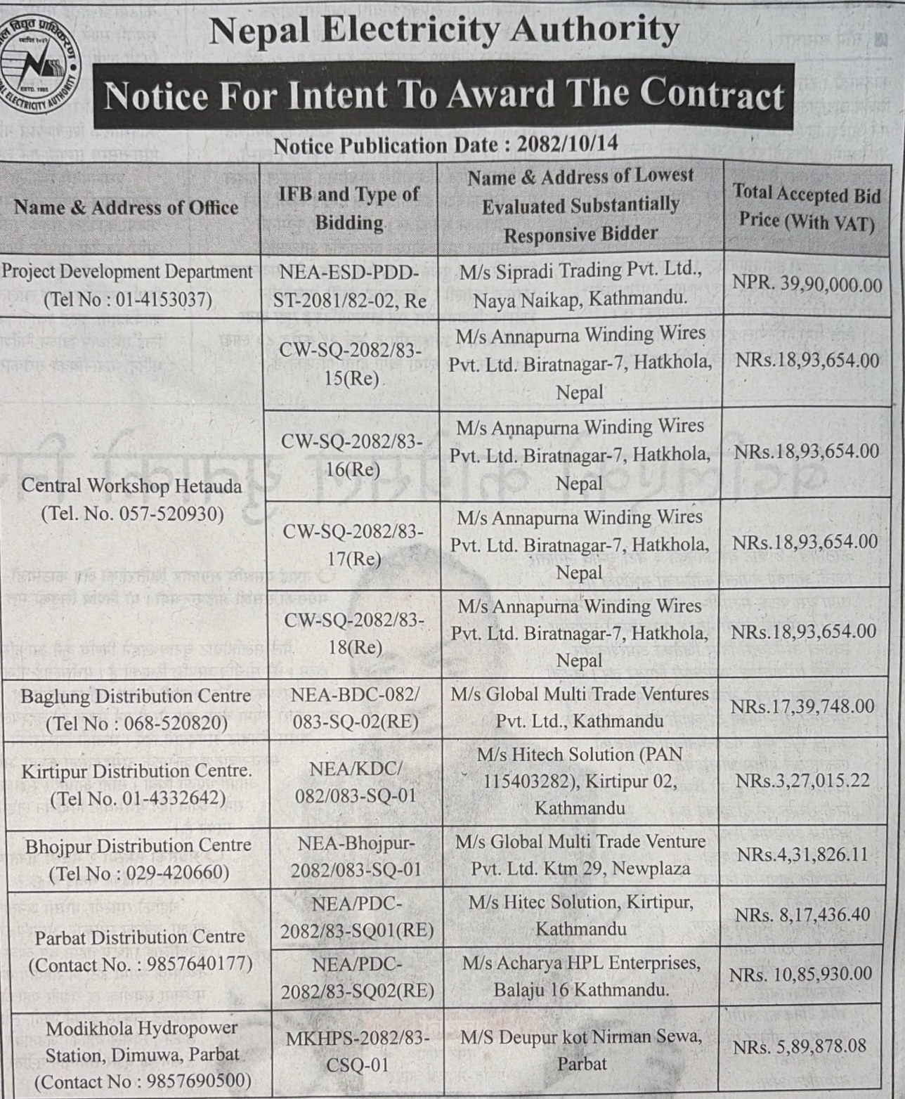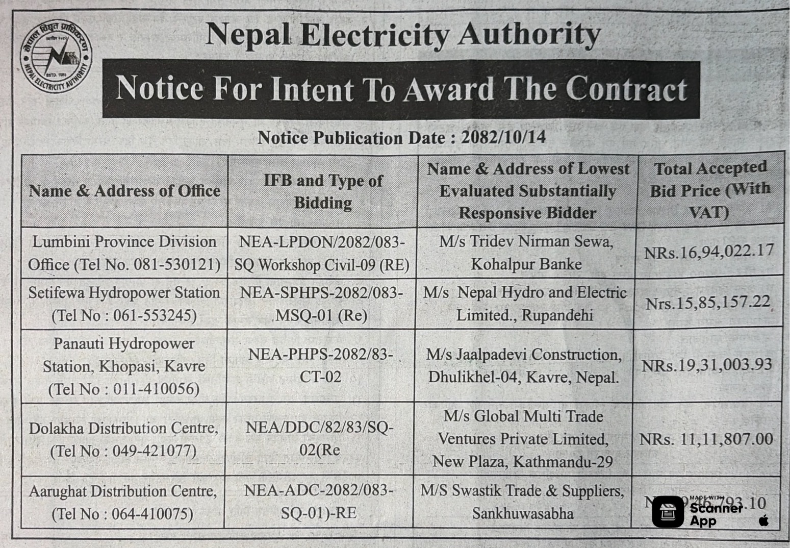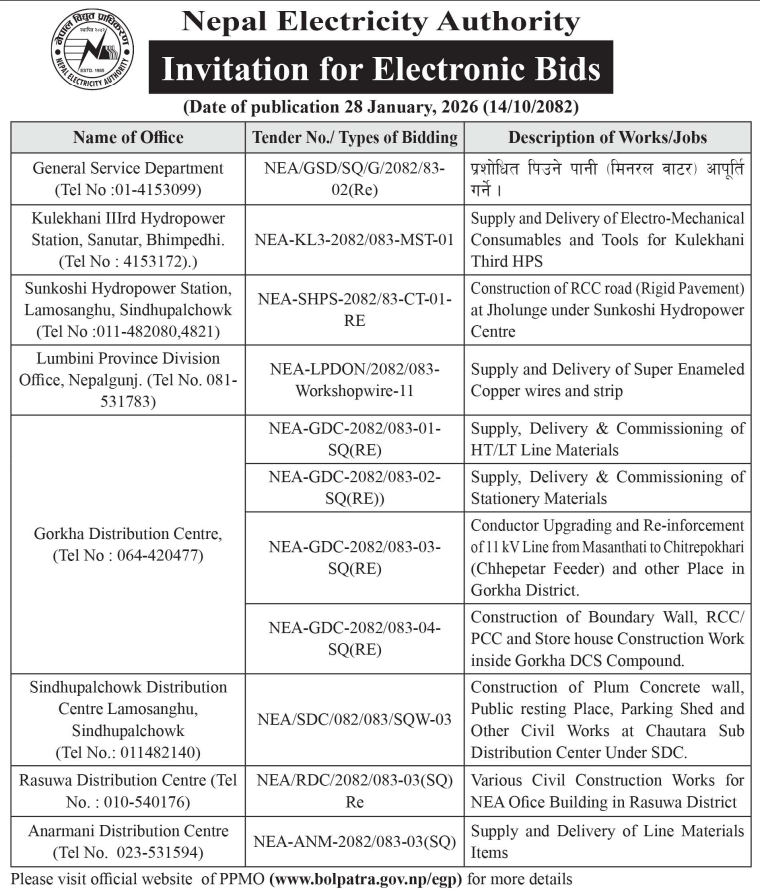 | 233 | NEA, Dolakha Distribution Center | Procurement for Civil Works for Dolakha Distribution Center. | 27/01/2026 | PPMO | 11/02/2026 | Click Here | |