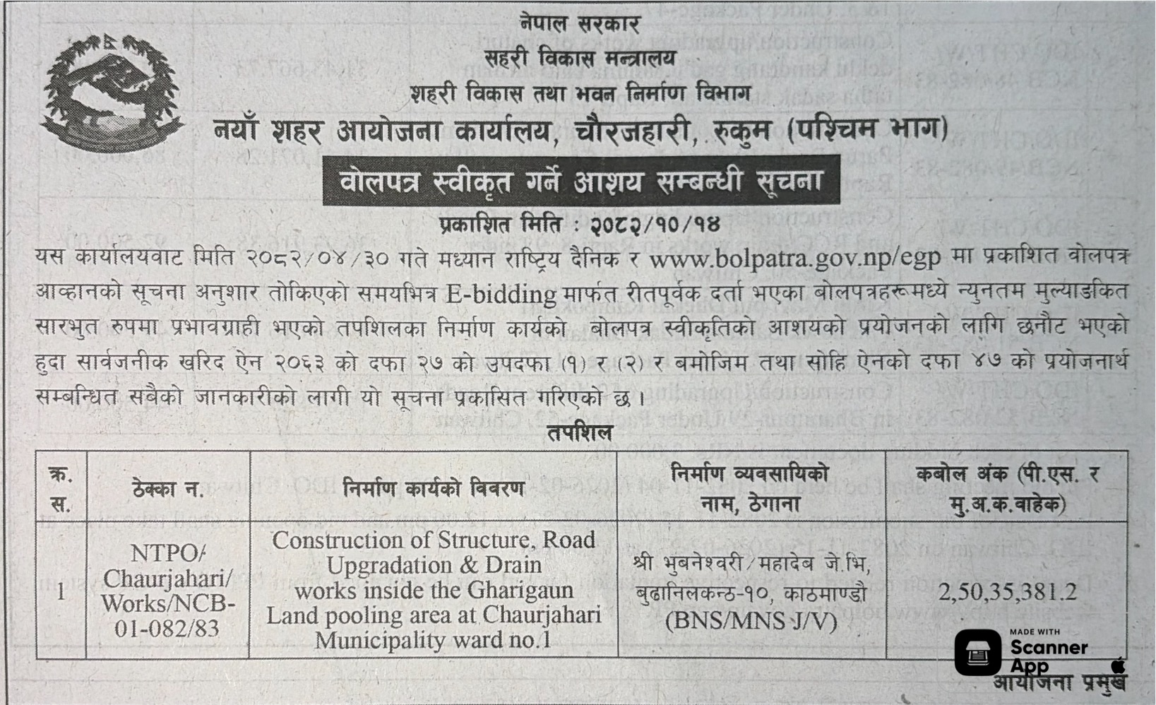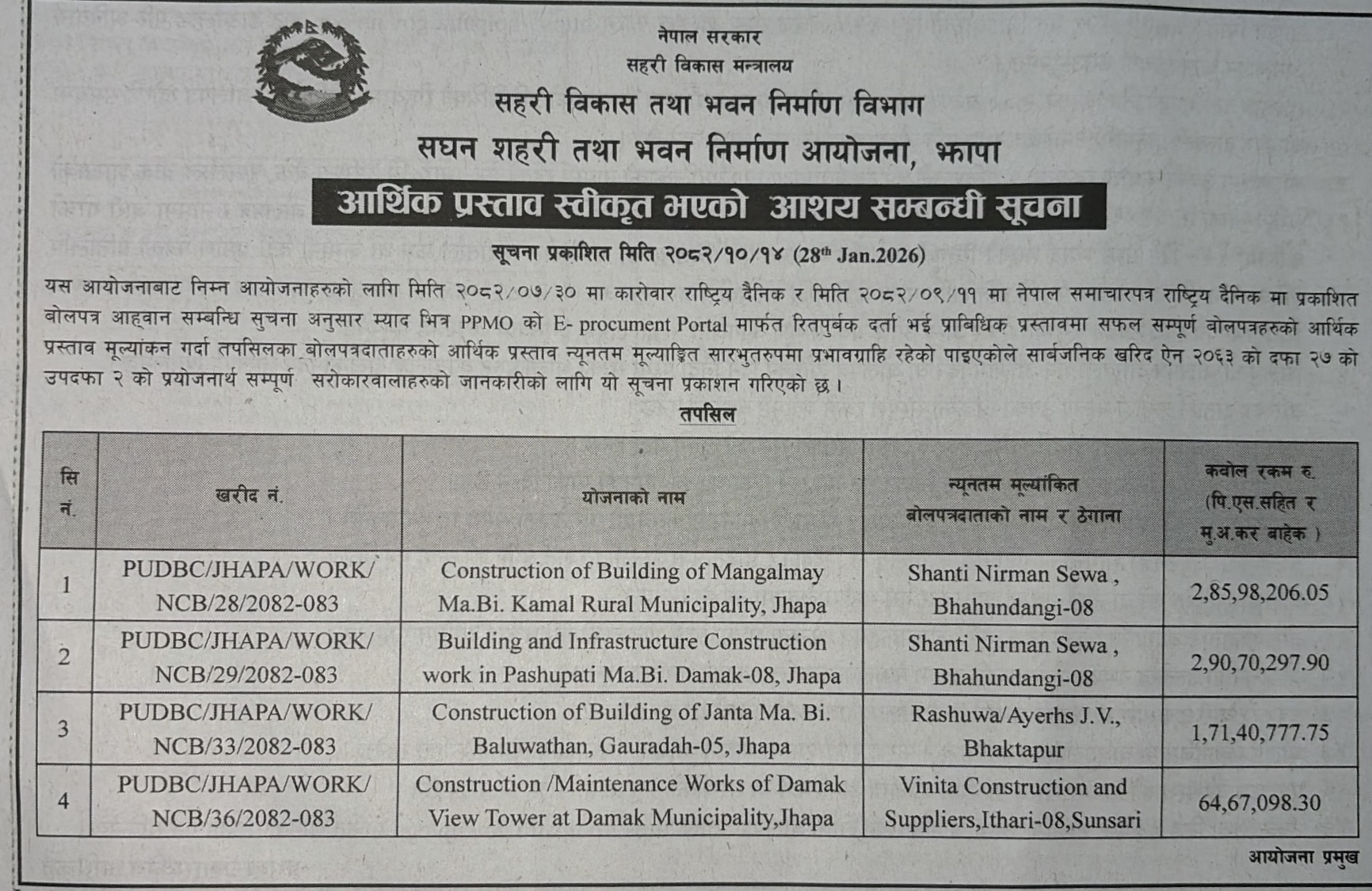 | 216 | Chandrakot Rural Municipality, Gulmi | Natural Jharana Yuwa Club Bhawan Nirman | 27/01/2026 | PPMO | 11/02/2026 | Click Here | |