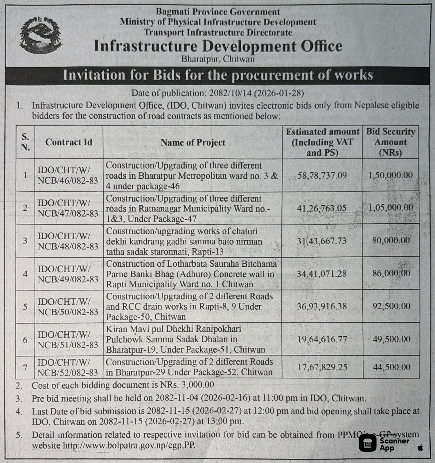 | 236 | Bharatpur Metropolitian City Office, Bagmati Province, CHITWAN; | Blacktopped Road Construction and Maintenance at BMC-2 | 27/01/2026 | PPMO | 11/02/2026 | Click Here | |