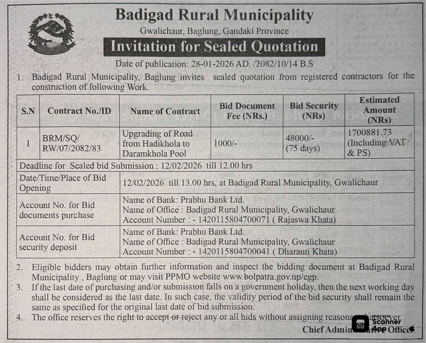 | 204 | Badigad Rural Municipality, Baglung | Riverbed materials extraction work from Badigad Khola Khaarapaani Bagar ( Badigad ward no.2) | 27/01/2026 | PPMO | 11/02/2026 | Click Here | |