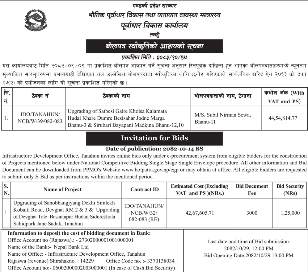 | 226 | Infrastructure Development Office, kawasoti, Nawalparasi(Bardaghat Susta East), Gandaki Province | Upgrading of Three different road of Hupsekot Rural Municipality 2& 3 | 27/01/2026 | PPMO | 11/02/2026 | Click Here | |