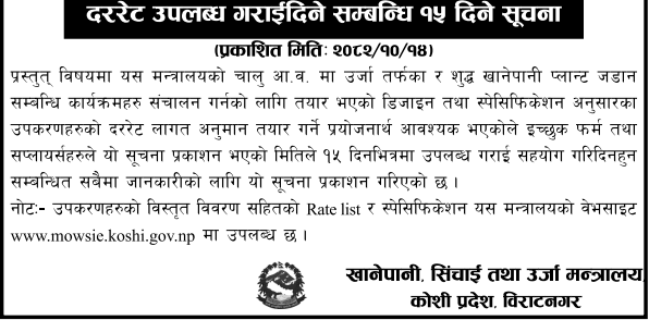 | 22 | Miklajung Rural Municipality, Panchthar | Procurement of Drinking Water Purifier Equipment | 27/01/2026 | PPMO | 27/02/2026 | Click Here | |