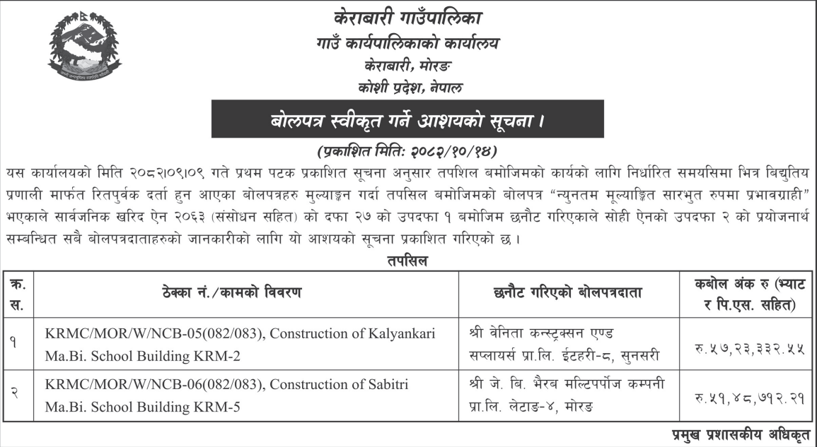 | 255 | Sahari Bikash Tatha bhawan Karyalaya Kavre | Mahakalestan Gorkhali Gau Motorbato Nirman , Bethanchok-3, Kavre | 27/01/2026 | PPMO | 11/02/2026 | Click Here | |