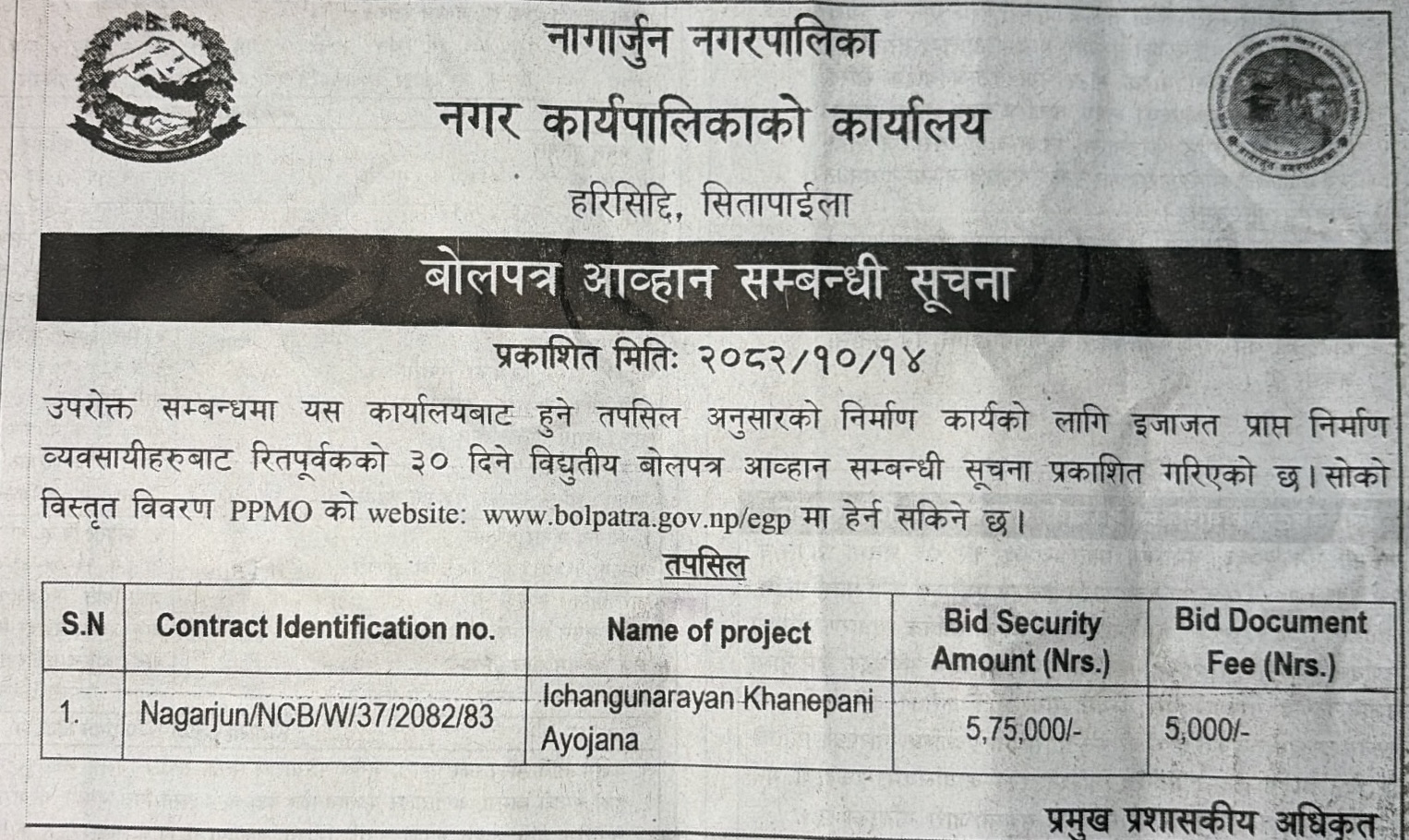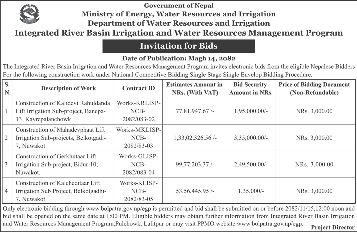 | 164 | Department of Water Resources and Irrigation, Lalitpur | Protection Works at Khahare Khola, Shivapuri Ga.Pa.-5, Serabagar, Nuwakot | 27/01/2026 | PPMO | 26/02/2026 | Click Here | |