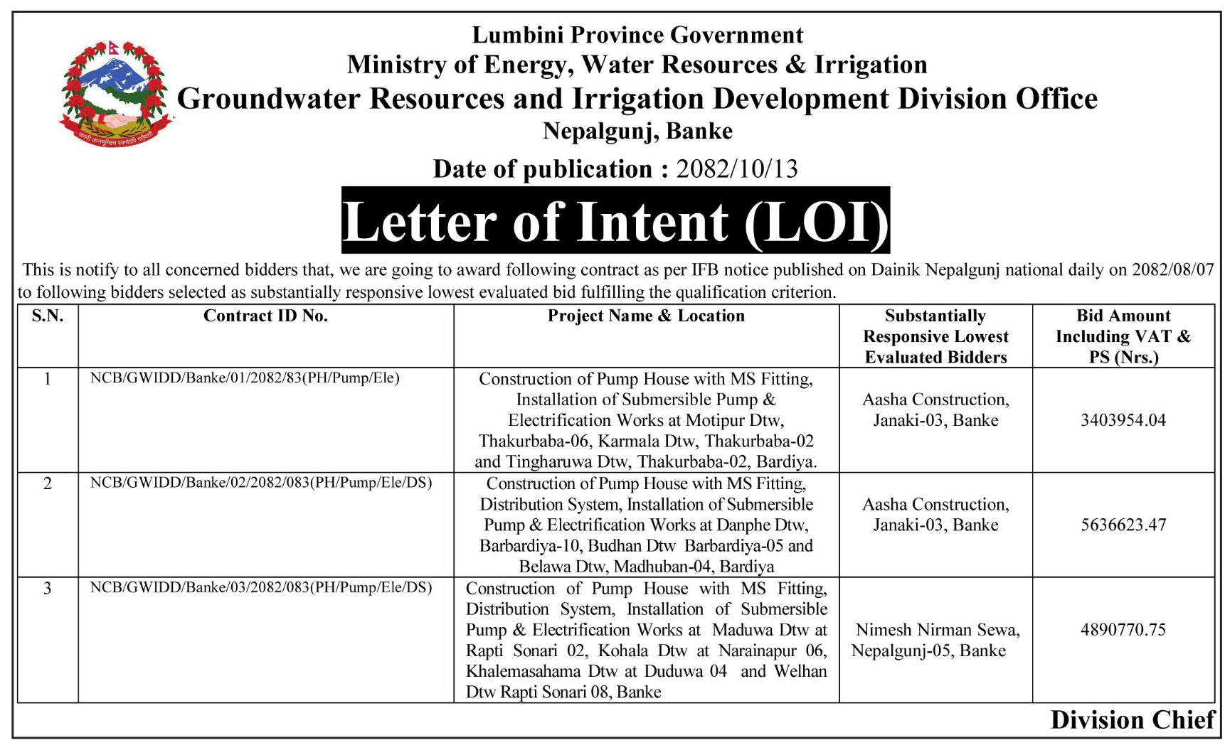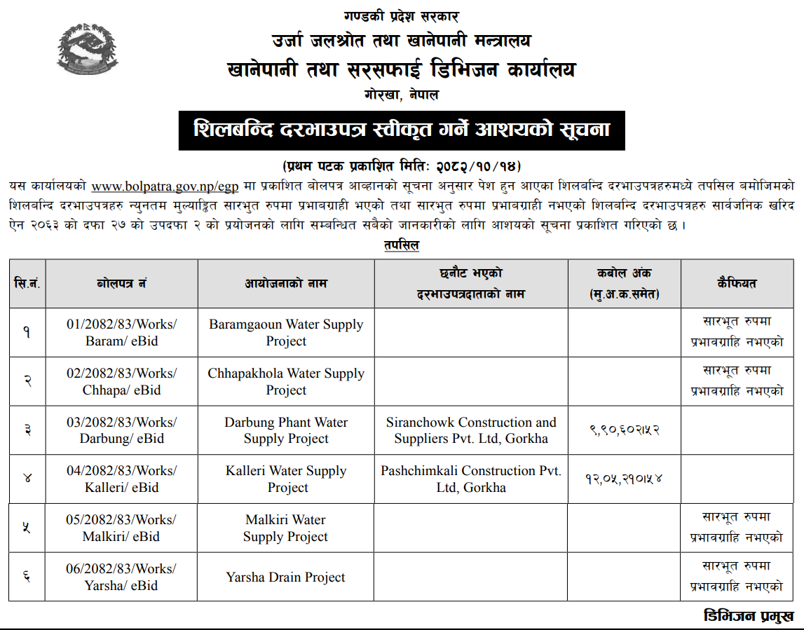 | 12 | Water Resource and Irrigation Development Division Office, Nawalparasi (East of Bardaghat, Susta), Gandaki Province | Construction of Pump Unit, Pump house & Electrification Work of New Kumarbarti Deep Tubewell Sinchai Jal Upabhokta Samiti Devchuli-13, Nawalparasi (Ba.Su.Pu.) | 27/01/2026 | PPMO | 11/02/2026 | Click Here | |