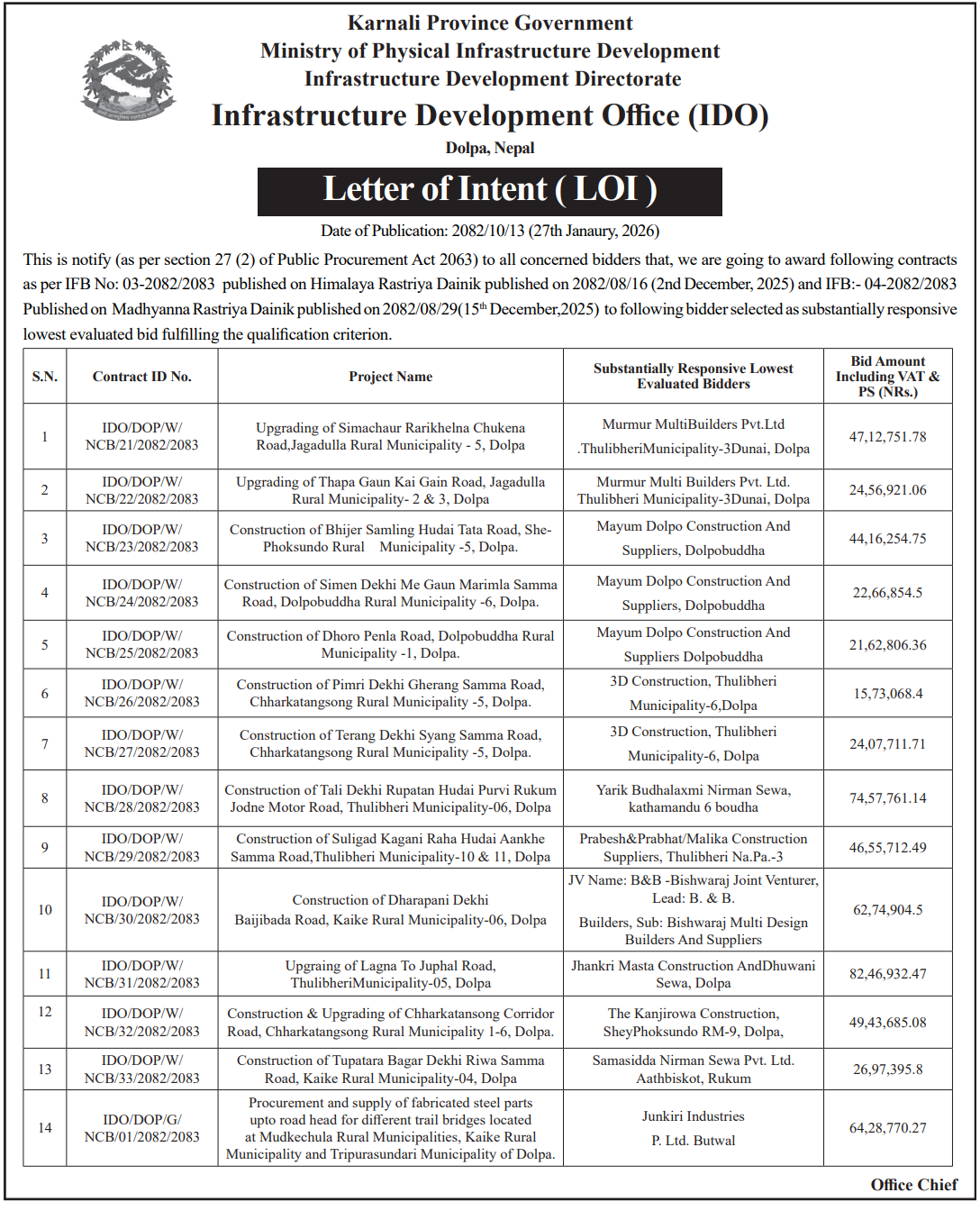 | 230 | Jiri Municipality, Dolakha | Upgrading of Buldanda Road | 27/01/2026 | PPMO | 11/02/2026 | Click Here | |