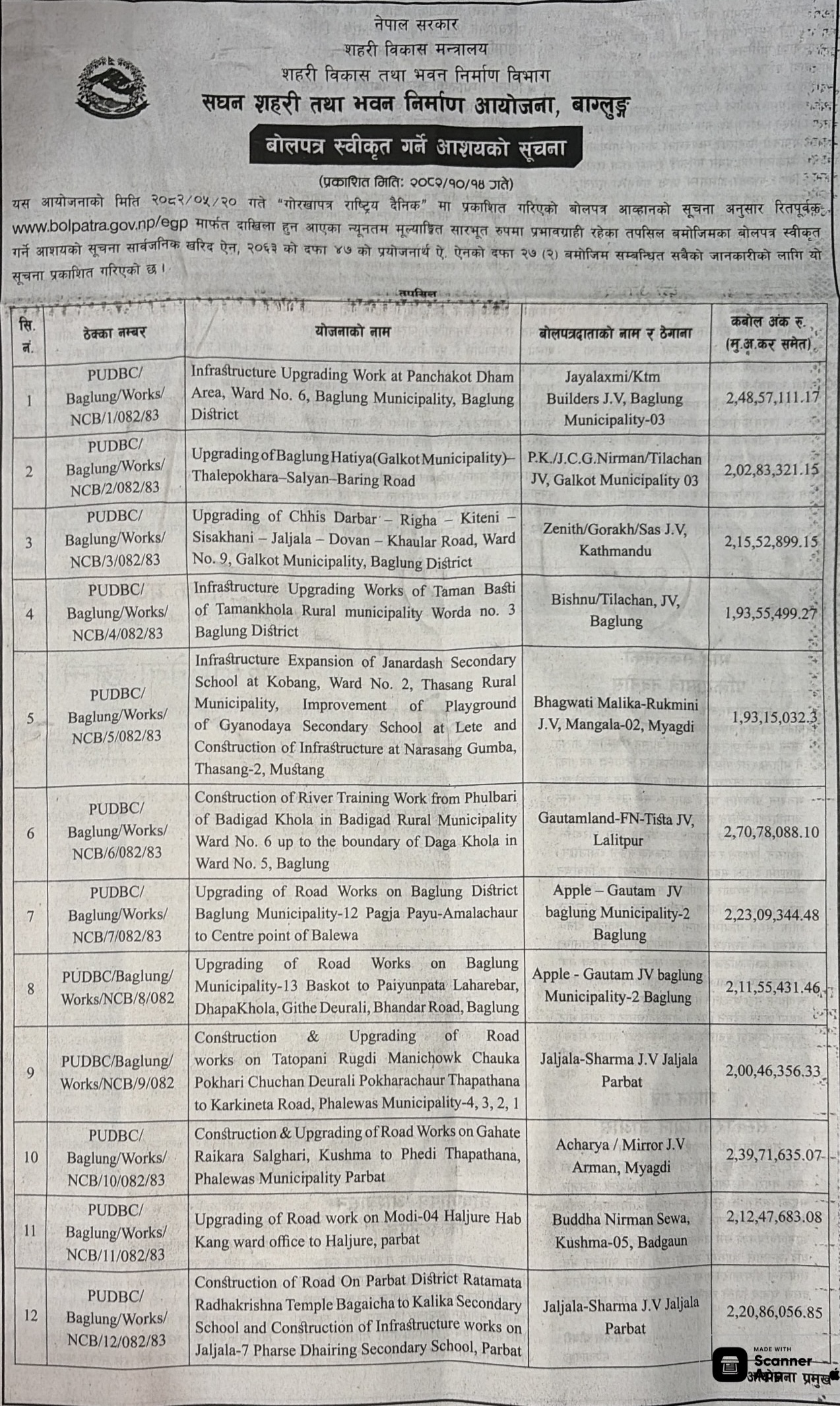 | 218 | Chandrakot Rural Municipality, Gulmi | Santhung Gurungghat Byawasthapan Tatha Truss Nirman | 27/01/2026 | PPMO | 11/02/2026 | Click Here | |