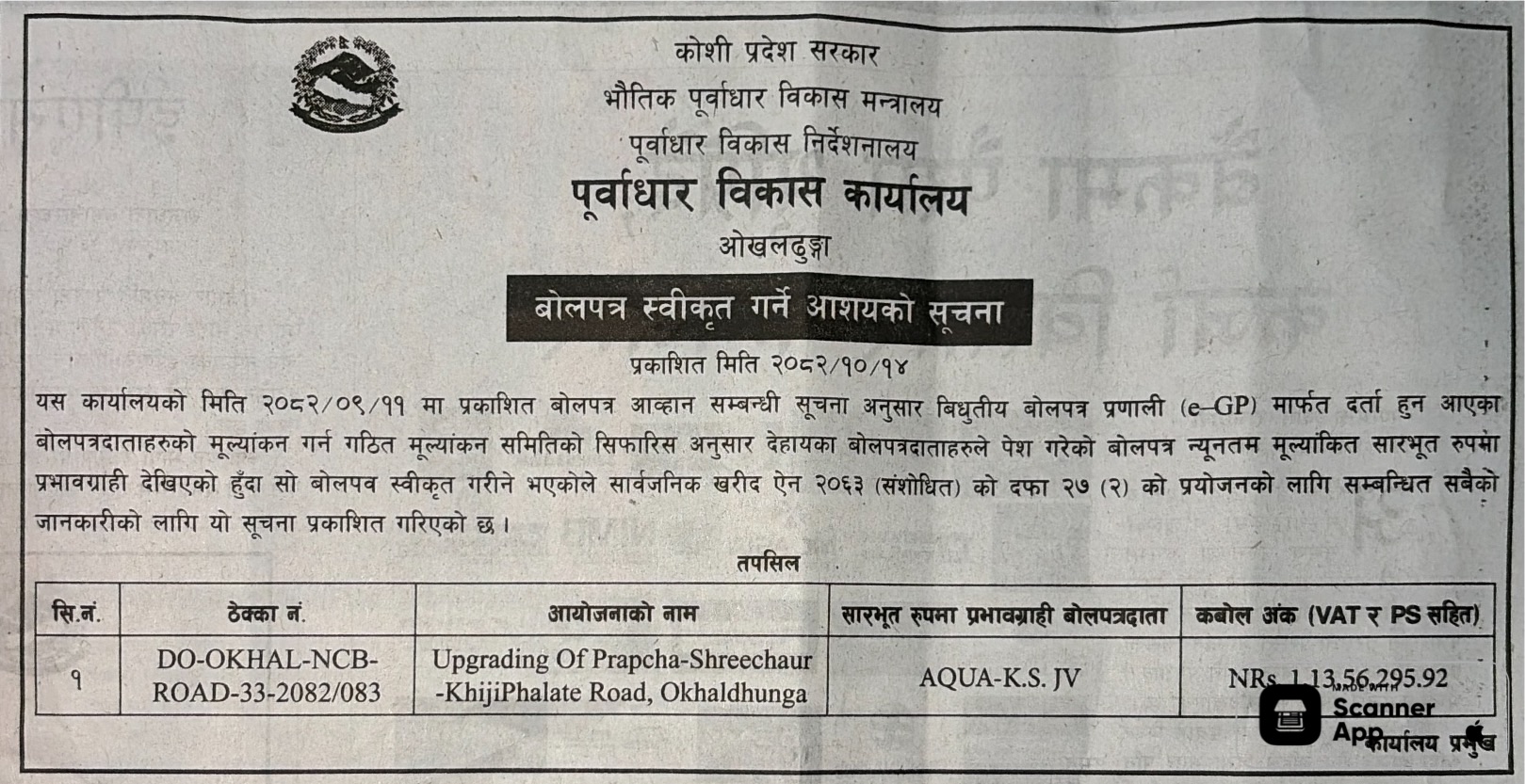 | 227 | Infrastructure Development Office, Khotang | Yawala Muktong Bayukhola Bansilaghat Sadak Nirmaan Yojana Barahapokhari | 27/01/2026 | PPMO | 11/02/2026 | Click Here | |