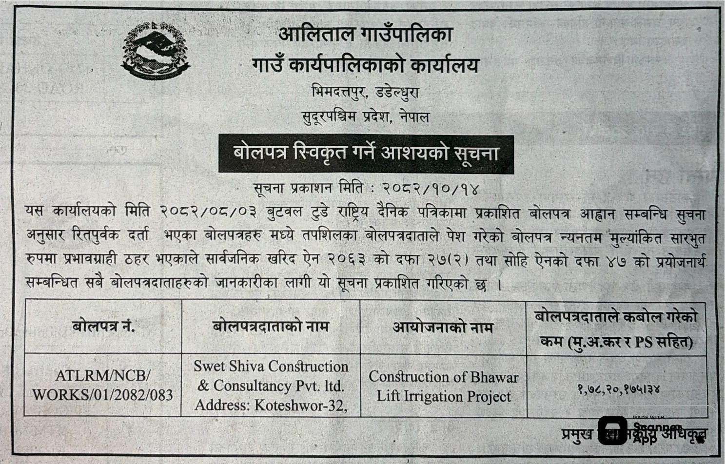 प्रदेश ७ मा प्रकाशित निर्माण सम्बन्धी बोलपत्र तथा आशयका सुचनाहरु