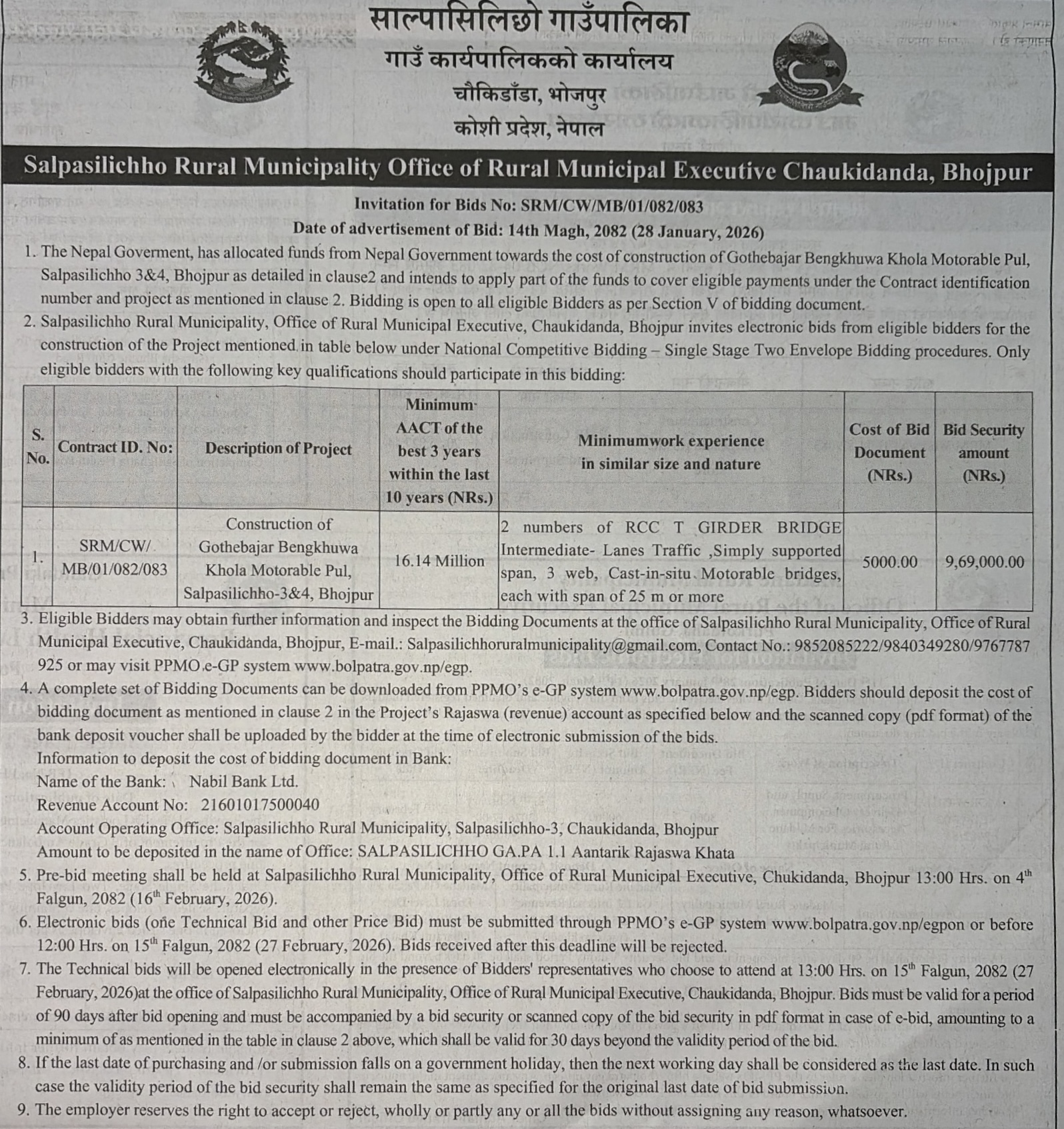 | 166 | Suspension Bridge Division (SBD) | Maintenance of Mansulighat (Musetar) trail bridge Sindhuli/Ramechhap. | 27/01/2026 | PPMO | 26/02/2026 | Click Here | |