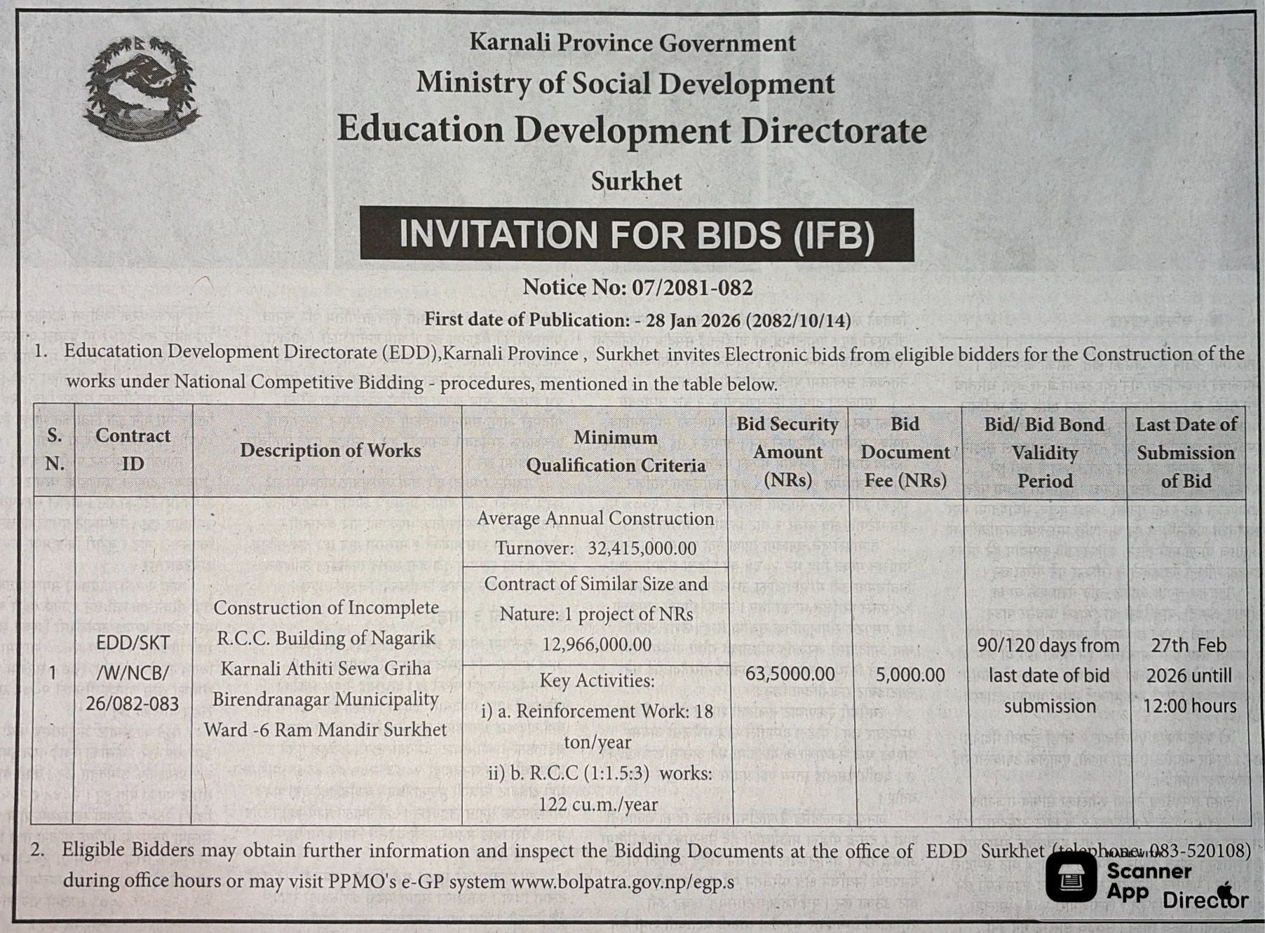 | 169 | social development office Kanchanpur | Samaj Kalyan Anchal Balanathalaya , Building Construction , Bhimdatt Municipality -04, Kanchanpur | 27/01/2026 | PPMO | 26/02/2026 | Click Here | |