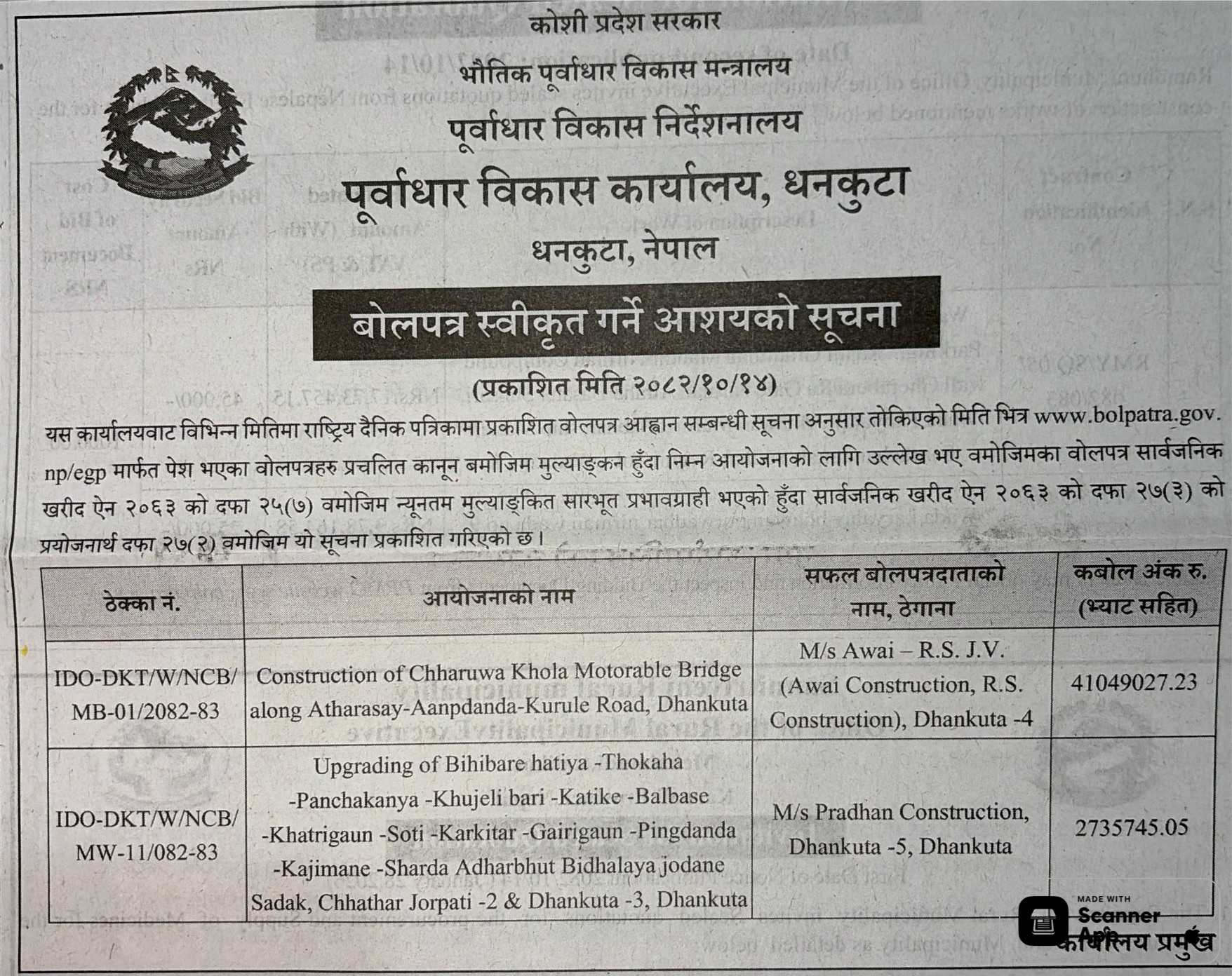प्रदेश १ मा प्रकाशित निर्माण सम्बन्धी बोलपत्र तथा आशयका सुचनाहरु