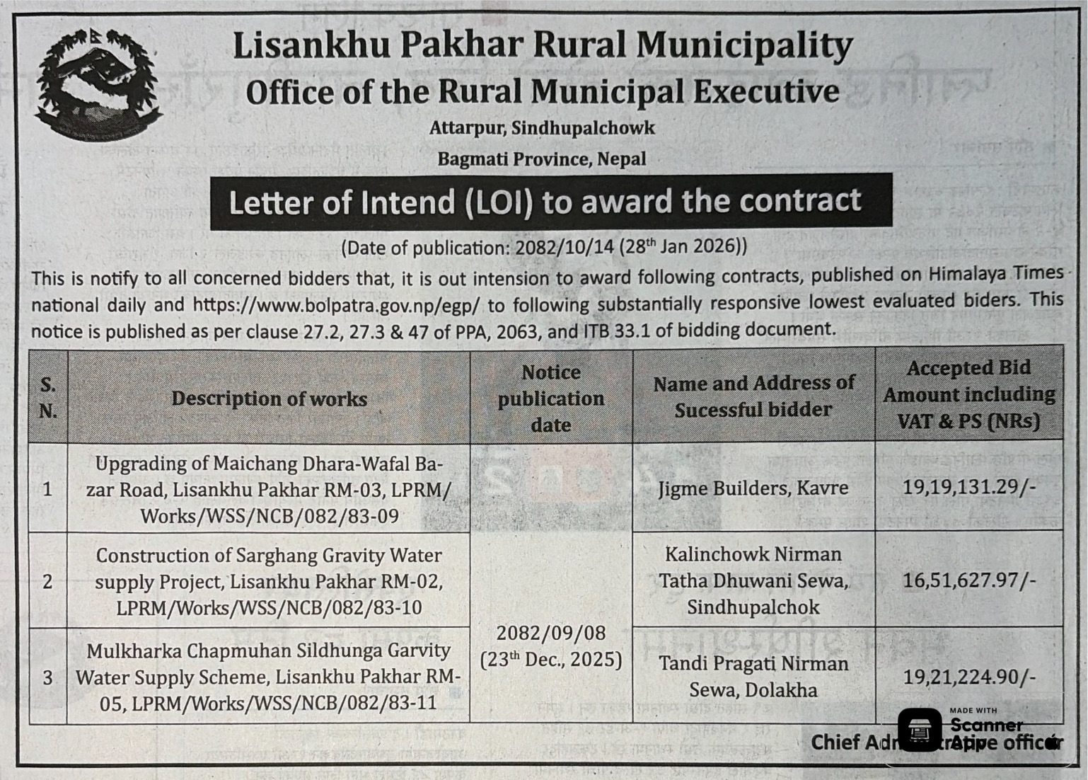| 4 | Sahari Bikash Tatha bhawan Karyalaya Kavre | Sangbari Khiping Rautgau Sadak , Bahrbise – 8 , Sindhupalchok | 27/01/2026 | PPMO | 11/02/2026 | Click Here | |