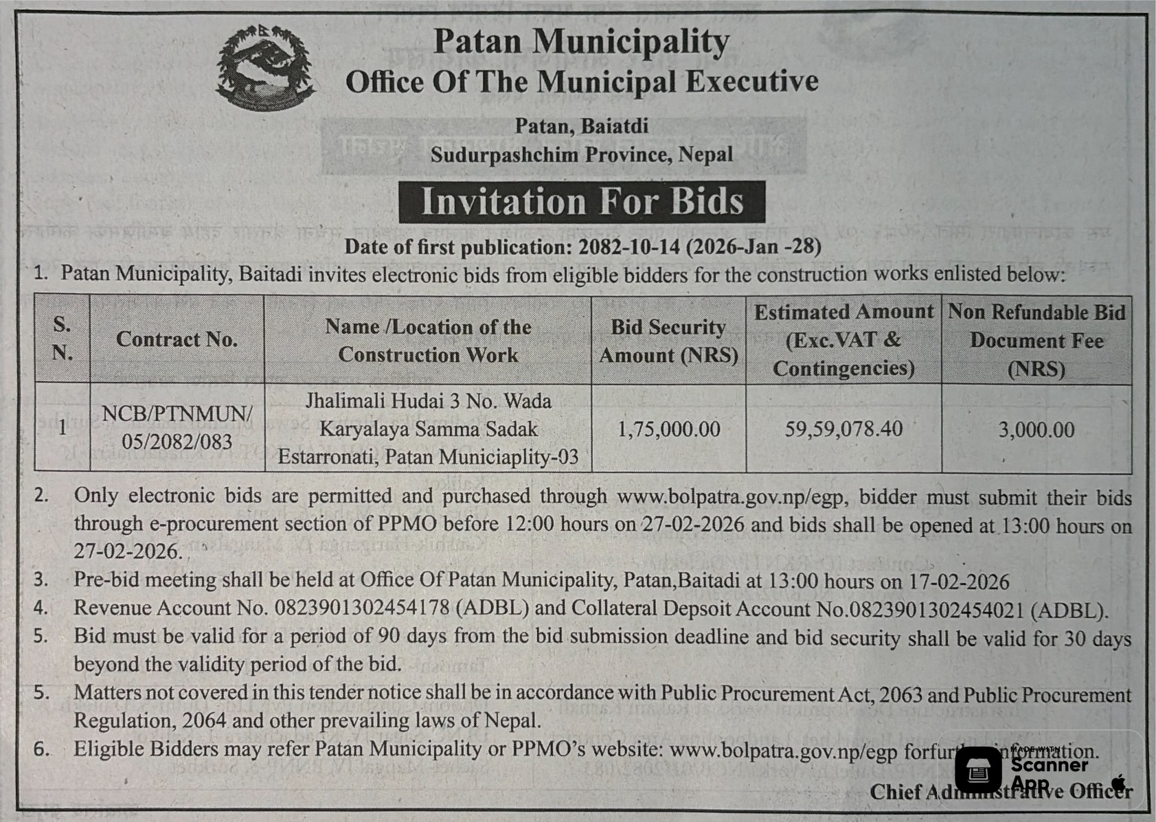 | 172 | Shikhar Municipality, Doti | Construction Works Around Office Area. | 27/01/2026 | PPMO | 26/02/2026 | Click Here | |