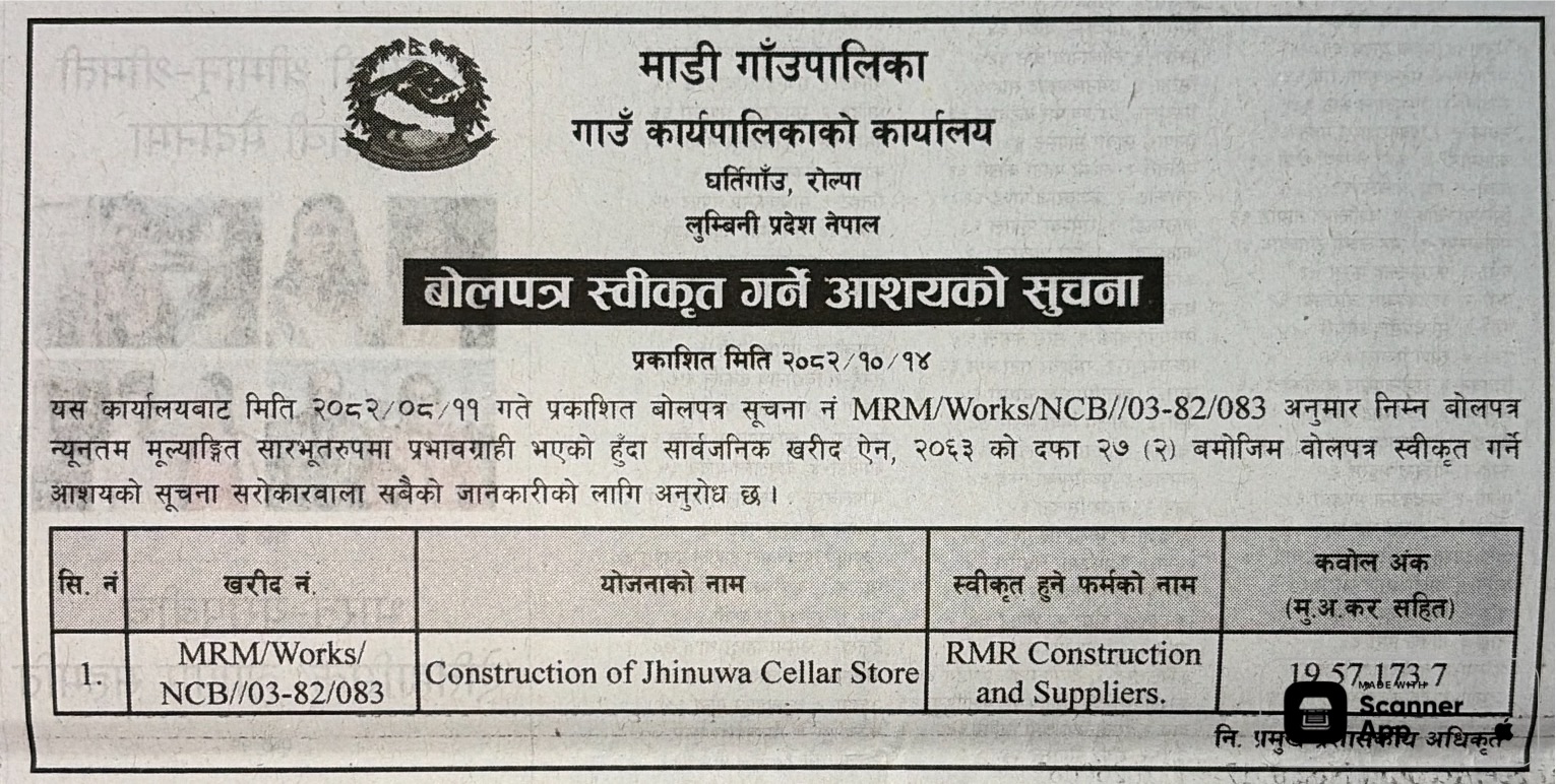 | 193 | Mayadevi Rural Municipality Office, Rupandehi | Construction of Physical Infrastructure Madarsa Daraul Hoda Islamiya Semarahana at Mayadevi 5 | 27/01/2026 | PPMO | 11/02/2026 | Click Here | |