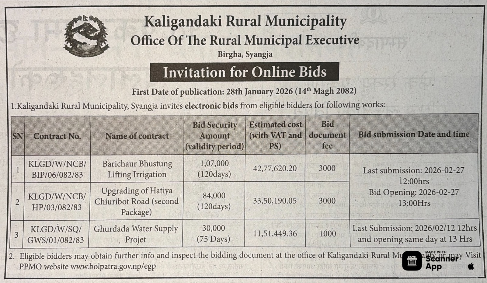 | 205 | Badigad Rural Municipality, Baglung | Riverbed materials extraction work from Badigad Khola at Jogi Bagar ( Badigad ward no.5) | 27/01/2026 | PPMO | 11/02/2026 | Click Here | |