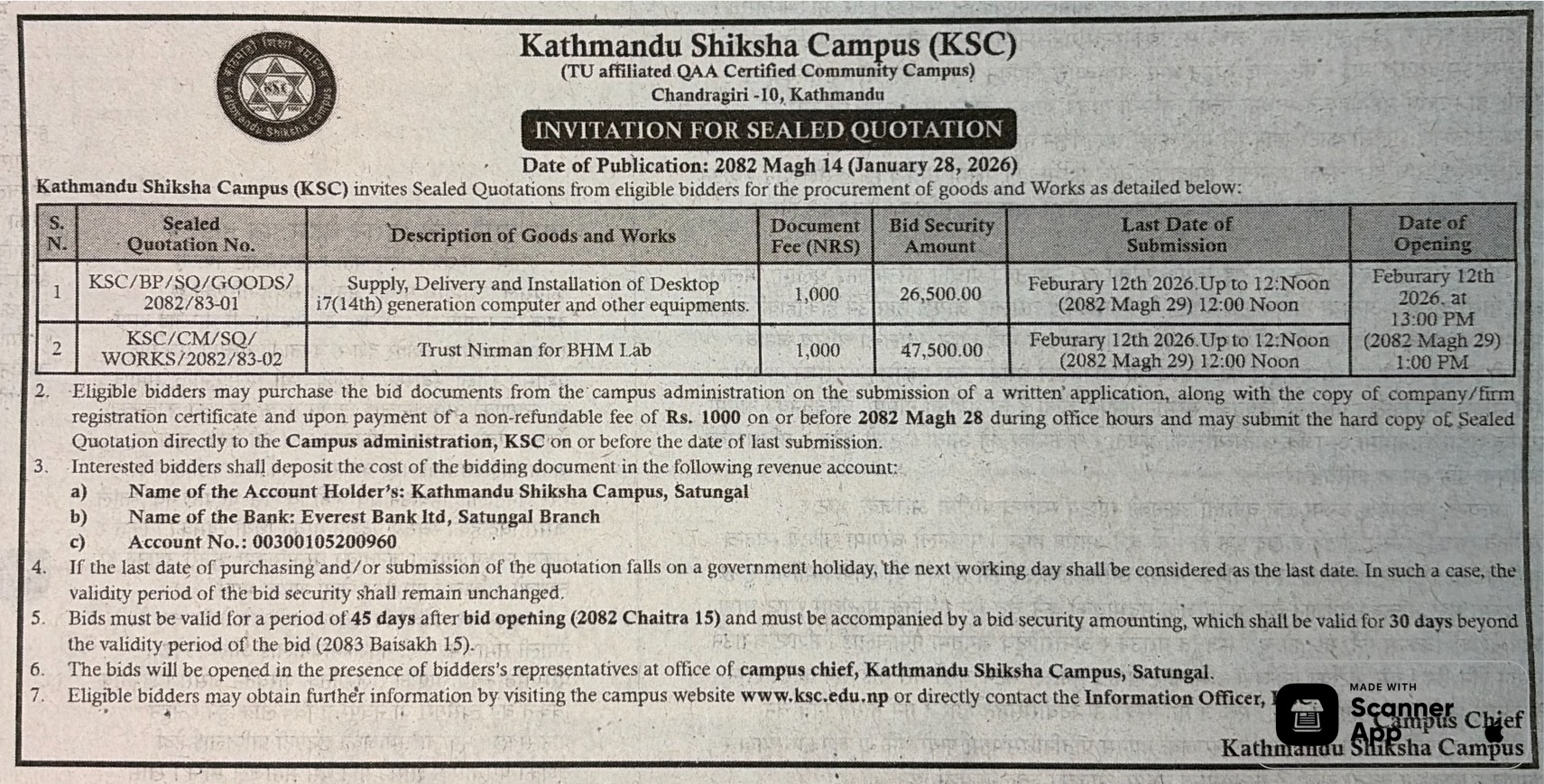 | 36 | Nagarjun Municipality Office, Bagmati Province, KATHMANDU; | Supply, Delivery and Installation of Desktop Computer, Laptop and Printers | 27/01/2026 | PPMO | 26/02/2026 | Click Here | |
