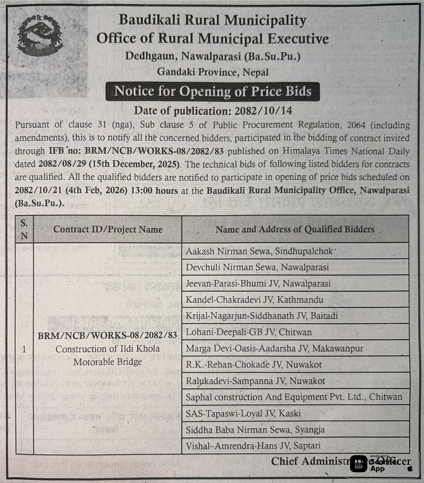 | 207 | Badigad Rural Municipality, Baglung | Riverbed materials extraction work from Badigad Khola at Turture Bagar Masane bagar & Banjade Bagar ( Badigad ward no.7) | 27/01/2026 | PPMO | 11/02/2026 | Click Here | |
