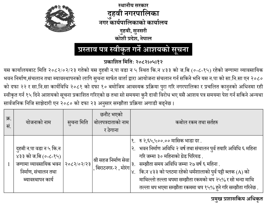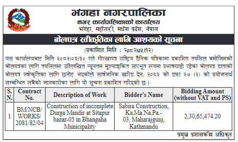 बोलपत्र स्विकृत ; Bid Award (Construction only) 28/08/2025 (Thursday)