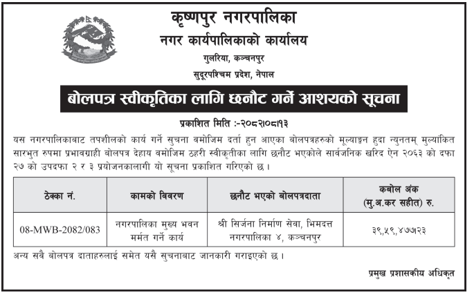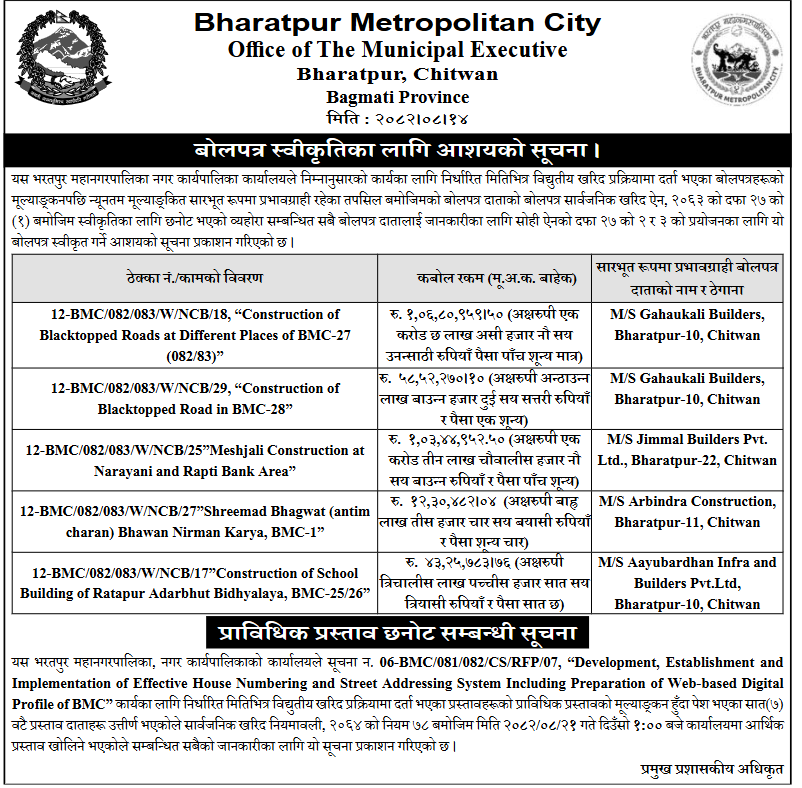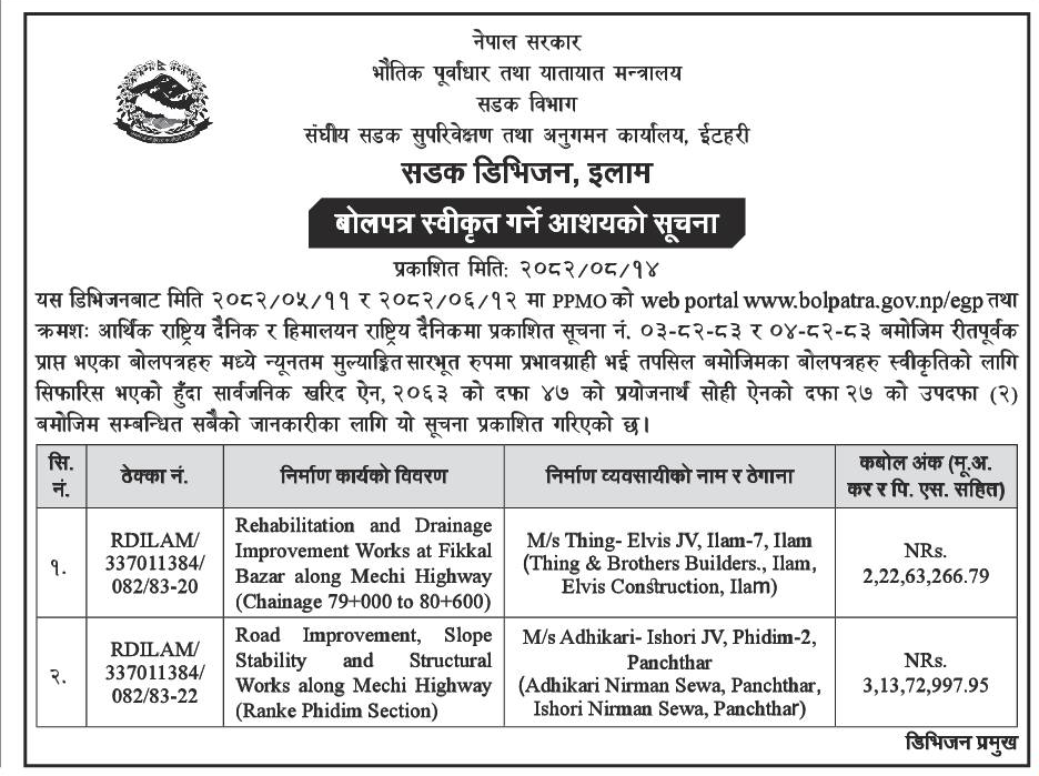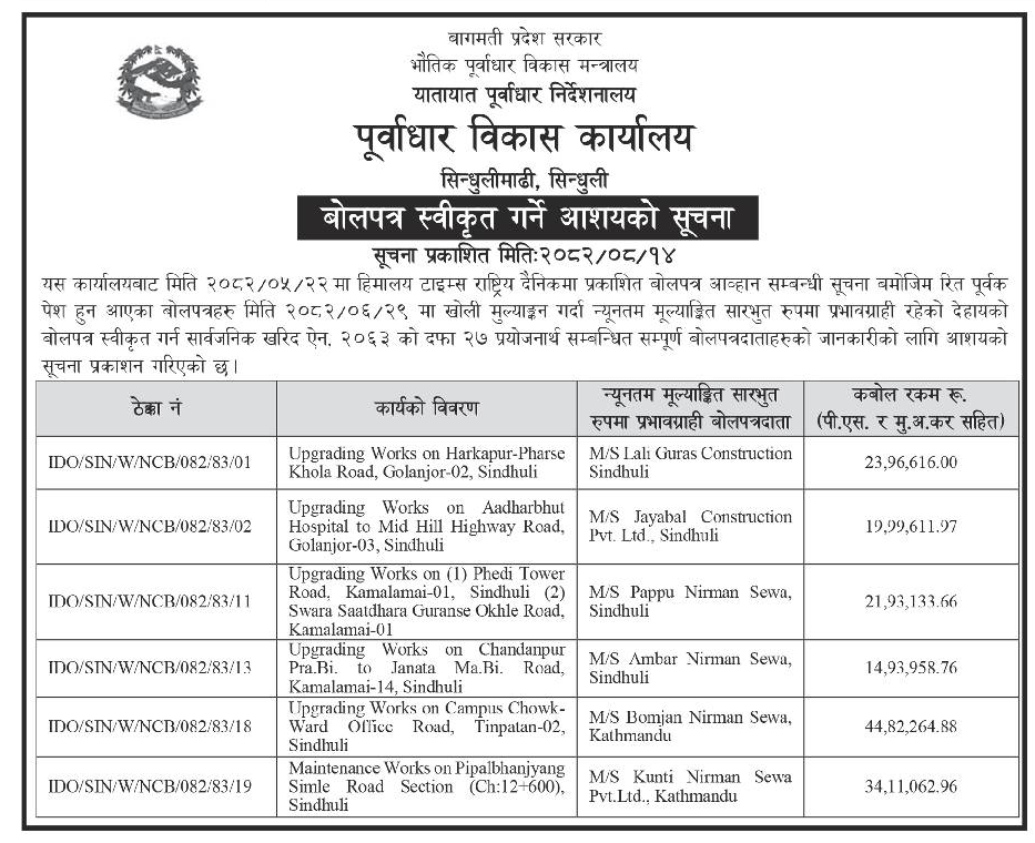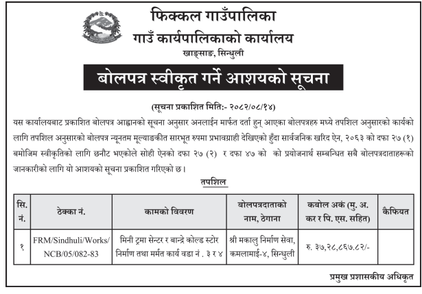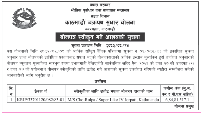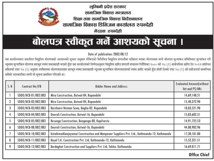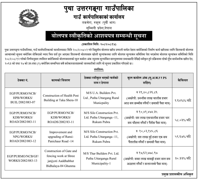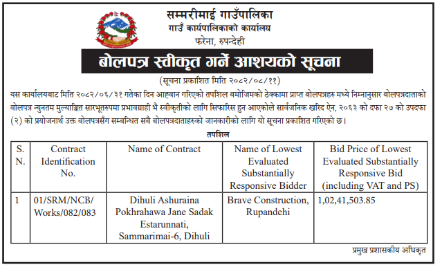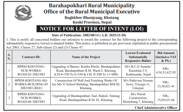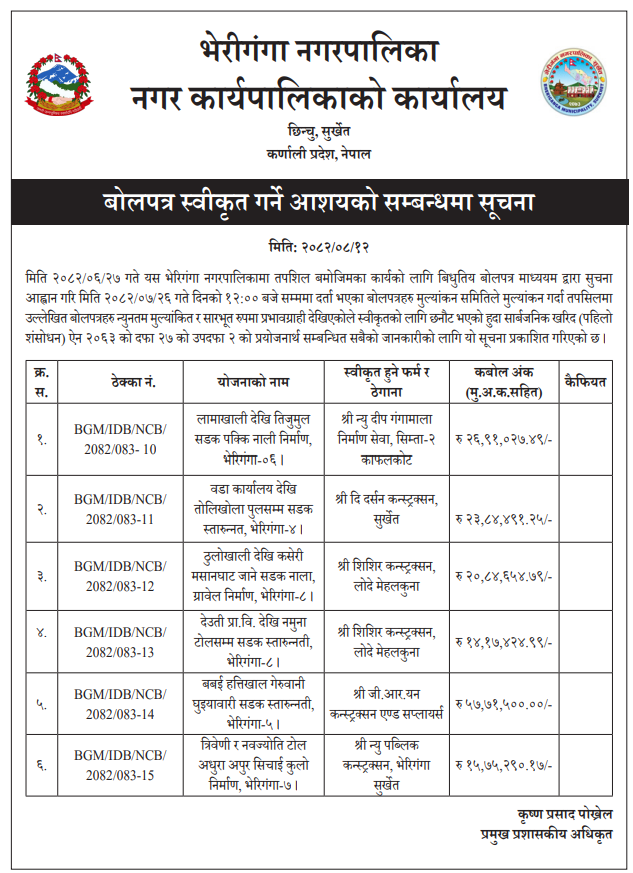 बोलपत्र स्विकृत ; Bid Award (Construction only) 30/11/2025 (Sunday)