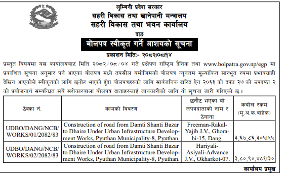 | 306 | Urban Development and Building Office, Rupandehi | Bhalaya Danda Takura Chheda SwamiRukh To Darali Tole Basti Bikash (Road Works), Sandhikharka-02, Arghakhanchi.(Re) | 28/11/2025 | PPMO | 14/12/2025 | Click Here | |
