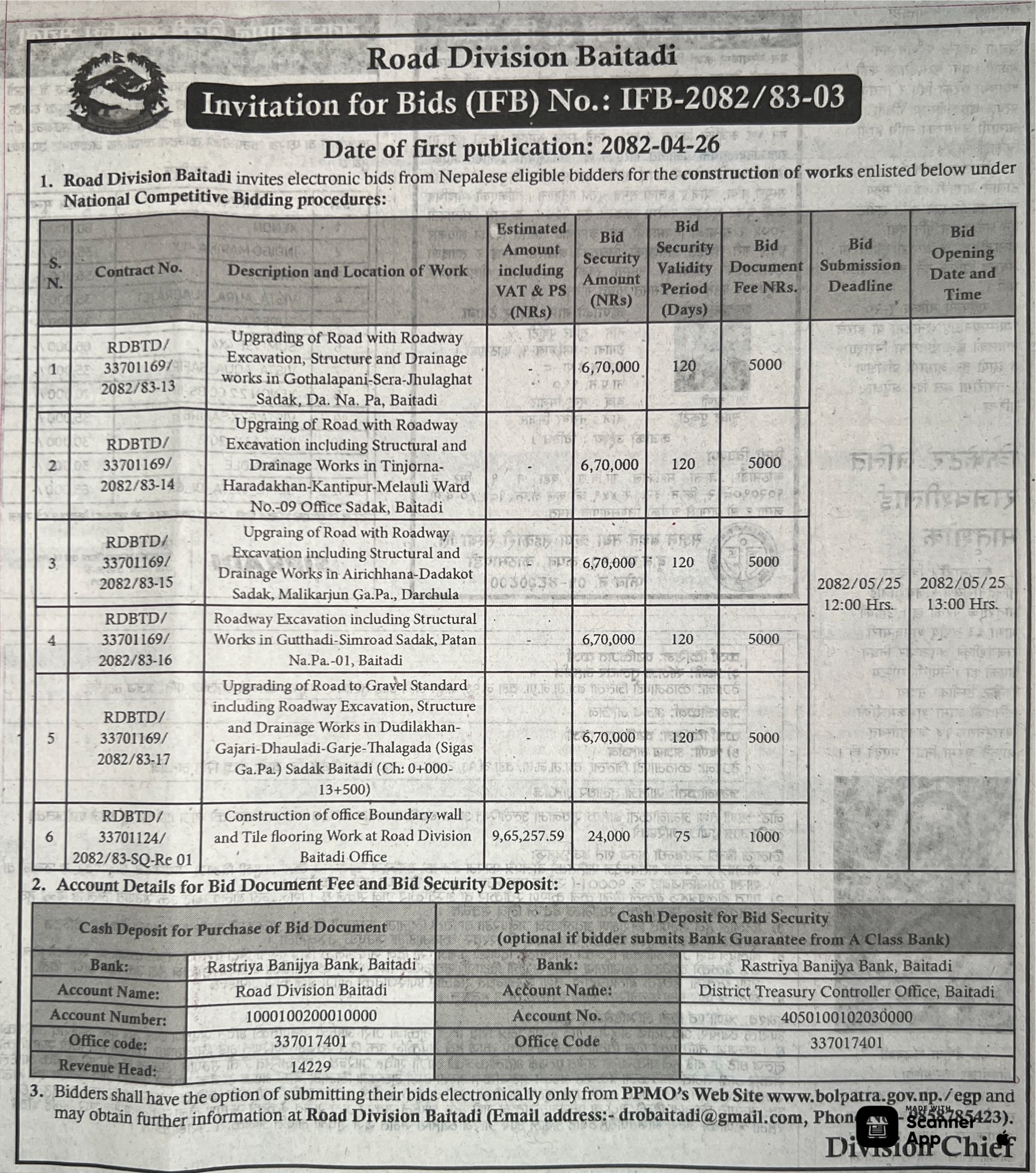 • Tender Notice Maintenance of Road, Construction of Bridge |
