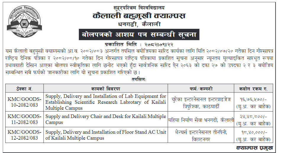 • Award Notice : Road Upgrading Work At Various Places (Swornikita Construction and Suppliers, Gatishil-Gravity JV) |