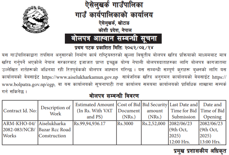 • Award Notice : Road Upgrading Work At Various Places (Swornikita Construction and Suppliers, Gatishil-Gravity JV) |