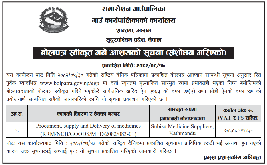 • Procurement of Medicine for Health Posts (2081/82), BMC |