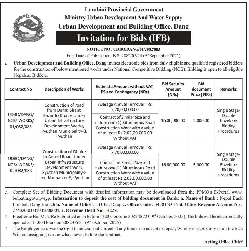 • Award Notice : Road Upgrading Work At Various Places (Swornikita Construction and Suppliers, Gatishil-Gravity JV) |