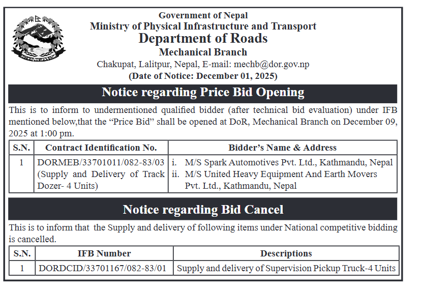 • Award Notice : Road Upgrading Work At Various Places (Swornikita Construction and Suppliers, Gatishil-Gravity JV) |